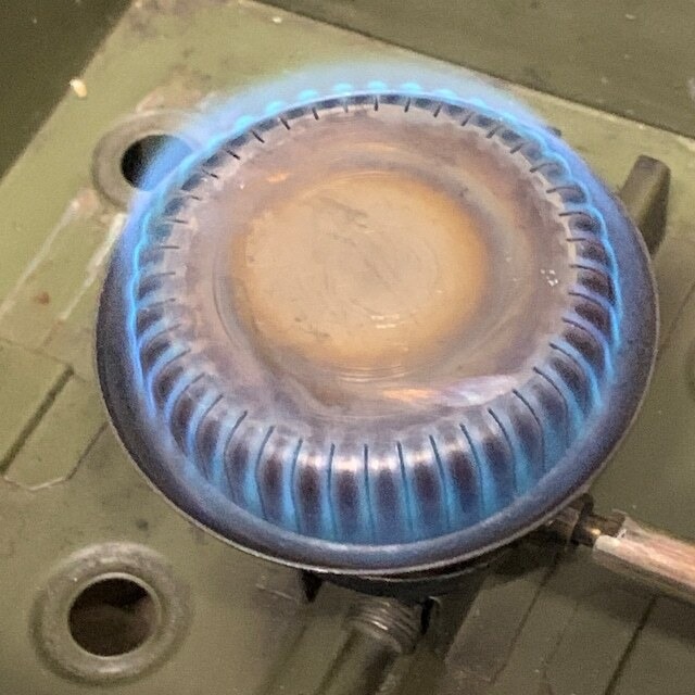 燃料用アルコールで予熱をし、ホワイトガソリンで火入れをし弱火から強火まで確認しました(画像7枚目)